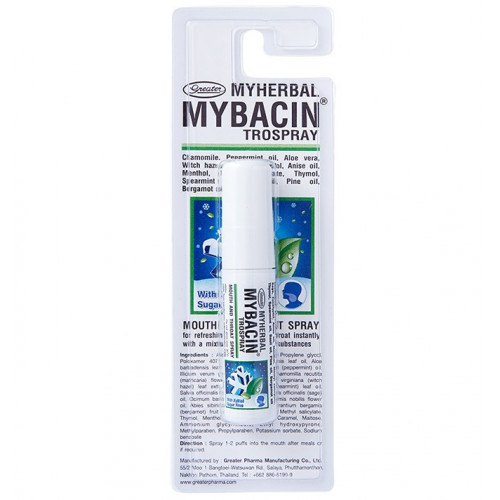 Спрей от боли в горле Мубацин Myherbal Mybacin Trospray - натуральное средство от боли в горле. Обладает эффективным антибактериальным действием, широко применяется для лечения различных простудных заболеваний горла таких, как фарингит, танзилит. Снимает боли и першение в горле, останавливает приступы кашля, облегчает дыхание.